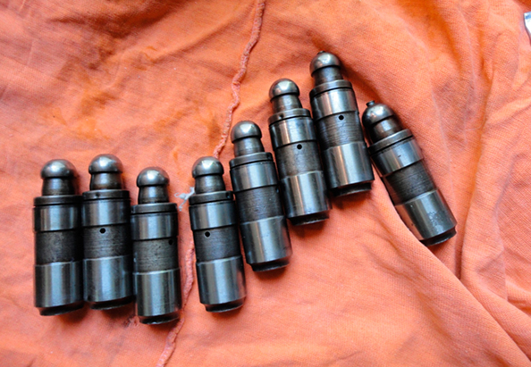 Гидравлические опоры разбираются после отсоединения стопорного кольца. Внутренние компоненты гидравлического толкателя можно «вытряхнуть», слегка постучав корпусом по металлической поверхности. Загрязненный компенсатор погружается в ацетон или другой растворитель. Визуальная оценка позволяет выявить внешние повреждения торцевой поверхности гидрокомпенсатора, выдерживающей давление (выбоины, царапины или вмятины). В процессе эксплуатации на торцевой поверхности может даже образоваться впадина.